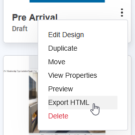You can export the HTML of a design while actively viewing or editing it within the email designer.