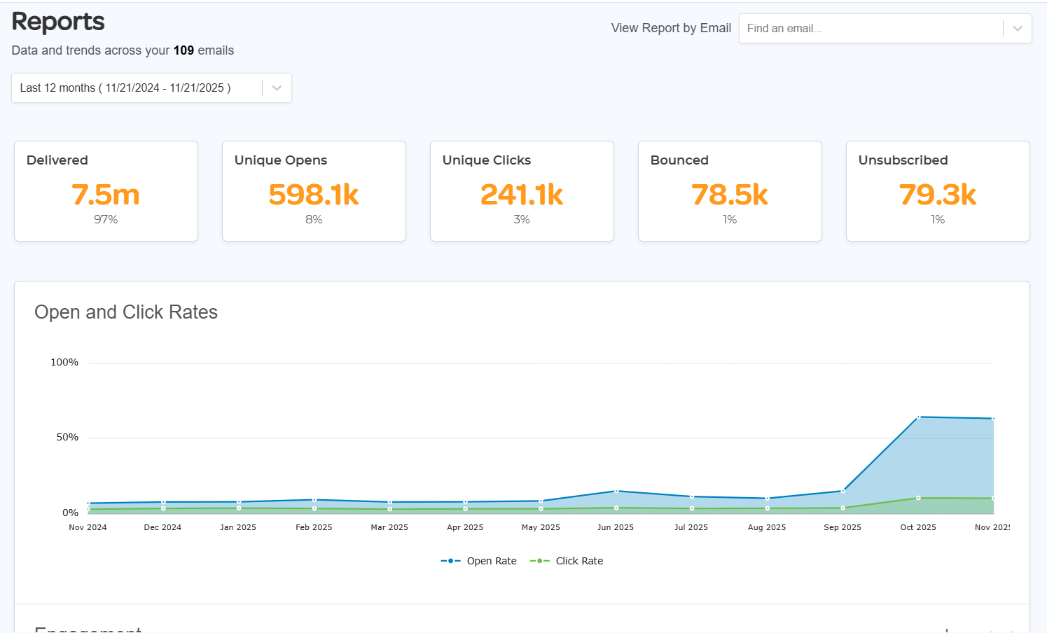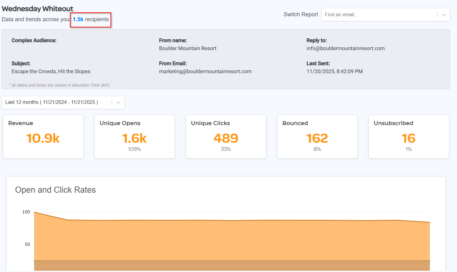 Once you have sent your email, you can view these statistics by specific emails by using the dropdown in the upper right corner of your screen.