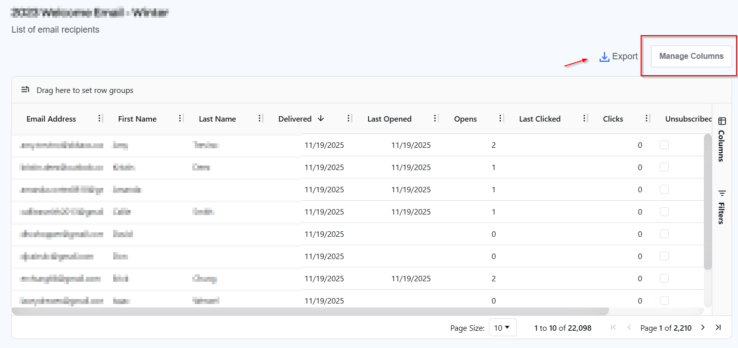 You can view a detailed report of your email sends by clicking on the number of people that your email was sent to. This will bring up a detailed report of the audience that this email was sent to as well as the open, bounce, delivered, clicks, and unsubscribe information. You can also change what columns you would like to see in the report and download this report into an excel sheet to learn more about your delivery metrics.