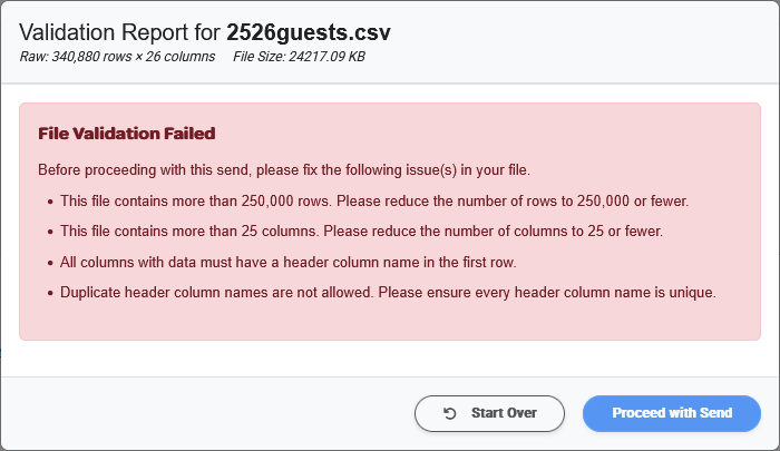 Ascent360 will validate your file against the rules above. If any of the tests above fail, you'll be asked to correct the errors before proceeding with the send.