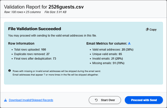 If the validation succeeds but detects invalid or missing emails, you may download a file containing only the invalid or missing email records. These are the records that would be skipped during the send.
