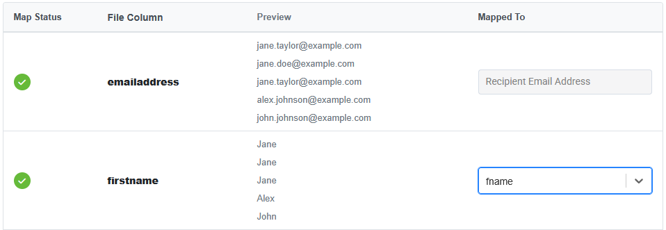 Upon entering the mapping interface, the column that you previously designated as the Recipient Email Address will automatically be mapped as such (and cannot be changed from this screen). The Preview column will show values from the first five rows for that column.