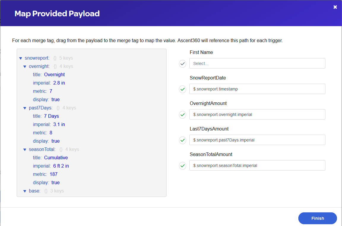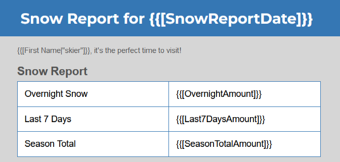 This email is sent to an audience of individuals who have signed up for snow reports. Because we are sending to an audience, the merge tag for First Name does not need to come from the payload data and will not be mapped.